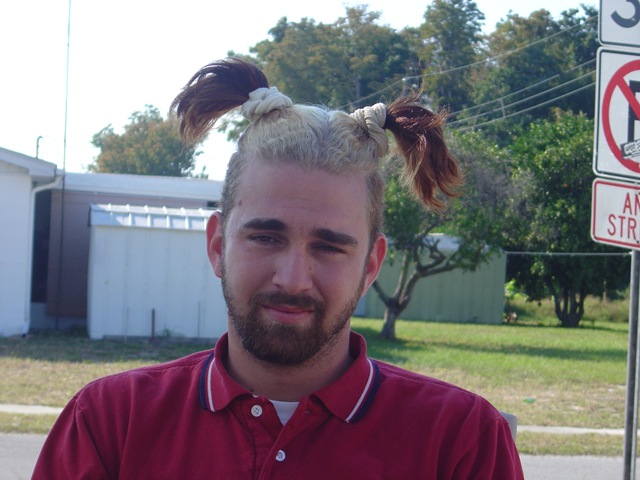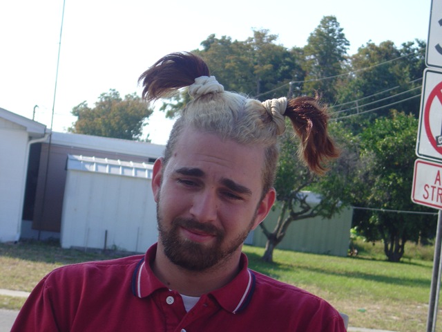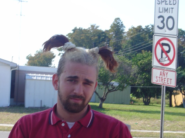 I was in shock since I didn’t see a fire warning label on the side of the can. To see it in real life was cool and I wouldn’t have ever believed that flames could come from Pimp Juice. After the Pimp fire we stuffed this thing with a lot of wood to se how big of a fire we could get in and out of it. I think it kinda looks like a rocket upside down. Well not much else has been happening and I’m getting into the shower now……… Oh yeah I let the girls play with my hair and this is what happened to it. I can’t sport that can I.![]()