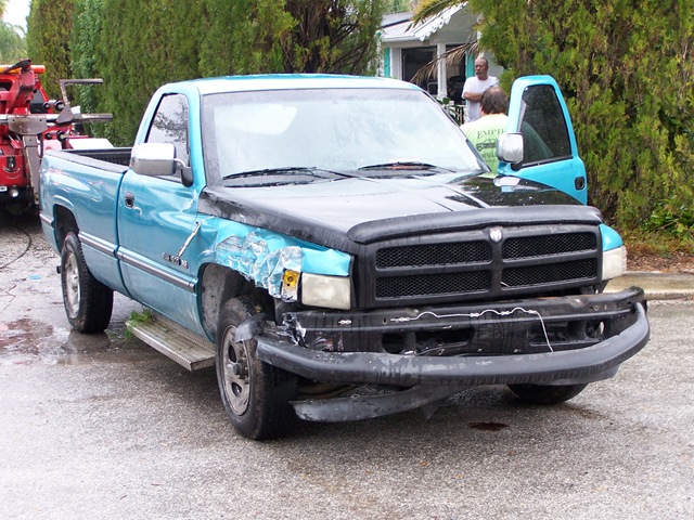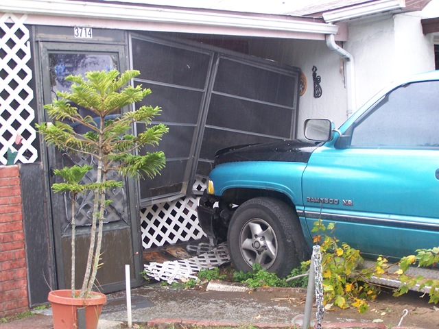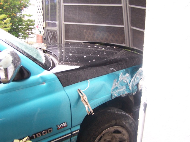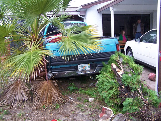 ed like she was in a bit of a panic. She started to tell me that someone had run into my Nana’s house. My first thought was, is she okay? And once that was cleared up I was like that is so cool. So I packed my girlfriends kids up in the car and got to my Nana’s as quickly and safely as possible. Once I got there I found out that the truck had already been pulled out of the porch and that there was no real damage to the house. The truck narrowly missing a palm tree and a brand new car had only hit the screened in porch causing no