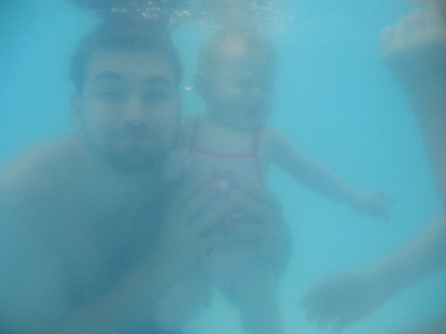 with Macey and Rich. We dunked Macey a few times after blowing in her face to make sure she held her breath and wouldn’t suck up any water. Macey had fun, well she didn’t cry at all while we were swimming or even after dunking her; so that, to me, means she had fun. Rich let us use his under water camera so that we could catch the moment under water. Some one should have take a picture of me dunking him.