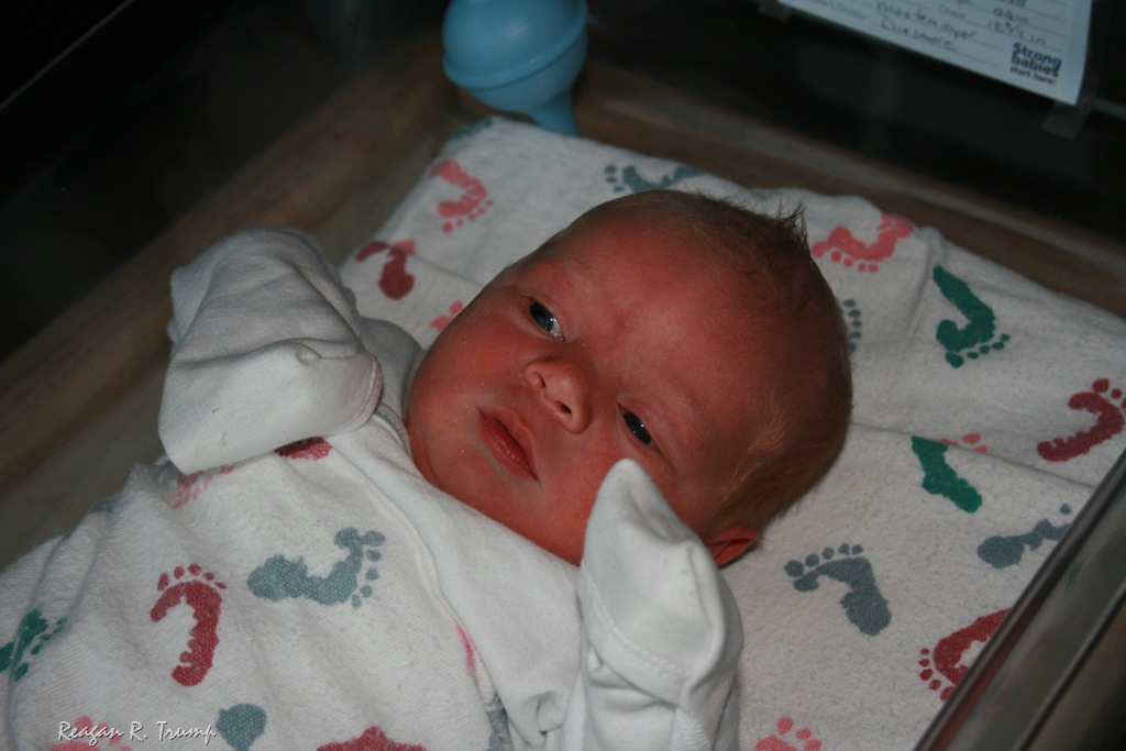 inches long and has a set of longs that any opera singer would cherish. Reagan R. Trump, my little me, has been so great to have around and has made Macey just a little jealous when he is in my arms. Monday the 15th was an adventuress day; our day started around 5:30am and ended just before midnight. Sarah and I really just hung out all day and she didn’t really have many contractions at all, but around eleven the contractions really picked up and things got really exciting. Sarah’s mom and my mom not only got to be in the room for Reagan’s birth they got to hold Sarah’s legs up for her; my sister got to record the entire birthing process (the video needs to be hacked and recoded, the camera didn’t close the file properly) I also got to be a part of the festivities, Sarah got to push and I got to catch our new little baby. That’s right; I got to catch my new little buddy. I really got to catch him, the only thing the doctor did was coach me on what to do and make sure the cord didn’t get wrapped around his neck. Wow it was so flipping cool and it is still so fresh in my head I love it. Once he popped out I set him on Sarah’s chest and gazed in amazement on what had just happen. Next thing I knew I was grabbing scissors and cutting the cord physically linking my son to my wife. That cord is some tough stuff to cut threw and just a little scary, after he was all cleaned up I got to cut the cord closer to his belly. Reagan was a little screamer while getting all cleaned up and I was all smiles, (not because he was screaming, but because I was so happy). After he was born and the video was shut off we really stared taking pictures, three camera were just flashing away for about an hour. Sarah looked so happy and relieved, I was so excited and all smiles, my mom was crying and my sister was amazed at how “not so gross or bad” the whole process was, and Sarah’s mom looked so proud she had a little grandson. Rich came up too but had to wait out in the hallway because Sarah didn’t want any guys seeing the personals; that weren’t so personal at the time. All in all it was a wonderfully great night and has really changed my life for the better even if I lose a little sleep each night.