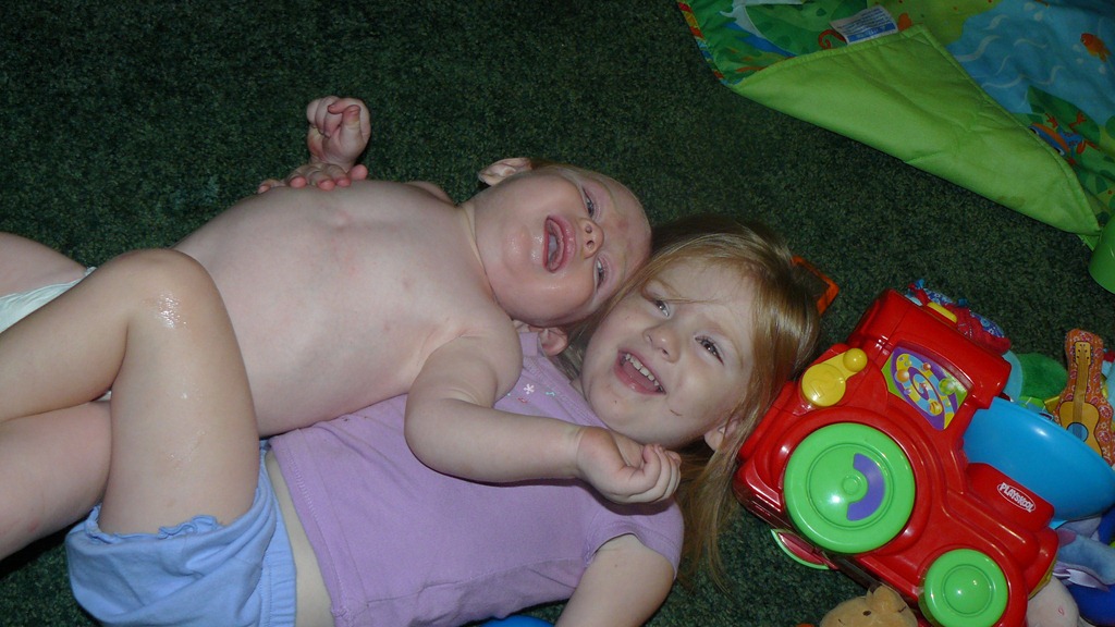 This is my new favorite picture of the little ones; they were wrestling and Macey pulled Reagan down on top of her. I have the video on my youtube page. Well you can watch the video below this picture. Macey is really taking to having Reagan around. Even here while we are at the mall and I am writing this; Macey is making sure that none of the other kids are messing with Reagan. I just hope that there are many more pictures like this to come.