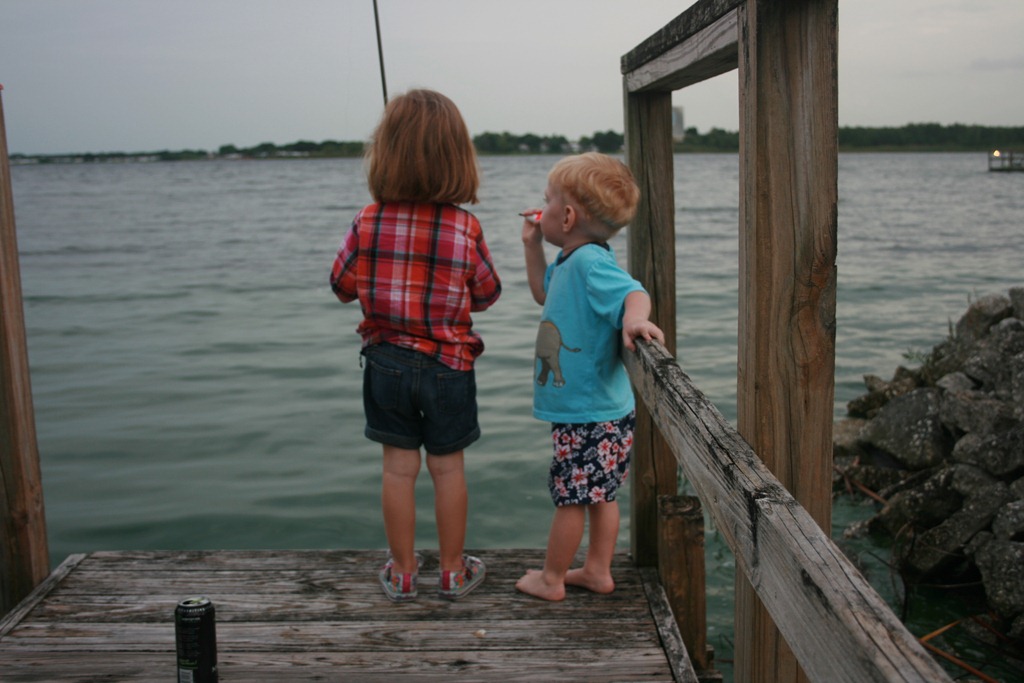 Thanks to Uncle Mike, Macey and Reagan got to go fishing for the first time ever. We were at Sarah’s grandmothers for my weekend and the four of us tried to catch some fishies. All the while Reagan wanted to look over the edge of the old wooden dock scaring the crap out of us and his mom who sat on the boat ramp watching . Macey almost hooked all of us at least once and wanted nothing to do with anyone casting for her. Reagan just wanted to sword fight with the poles. So there were five of us, Macey, Reagan, Sarah, Mikey and I. We had a good time until the mosquitos attacked.