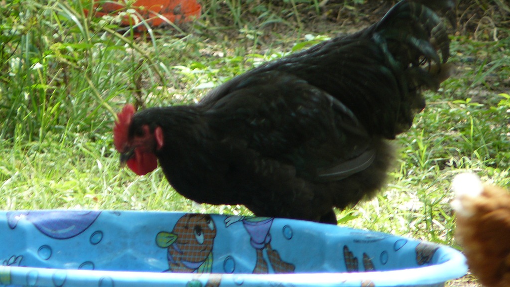 (the ducks with the chicken) that it really amazes me that I am now a keeper or birds. Lol. My Roo, the Jersey Giant, is now almost up to full crow and I believe size; with this I need to find a good inexpensive vet, who knows birds, to cut out Rex’s (the roo’s name) little but load voice box so I can keep his giant self around longer. He is a beautiful, some what tame, black with red bumpy dangle things, monster of a large bird with all the makings of a great flock keeper someday. The white ducks like him so much, that when I pick him up one of the little buggers bites at my toes when I am wearing my old worn out Rock Port sandals. It tickles really as it nibbles away at my little toes, but every once in a while they hit a tender spot and I cant help but to laugh like crazy and pretend to run from the little guy; it of course chases me as a laugh until I almost cry. The homemade chicken coop is staying together quite well and looks pretty good too.